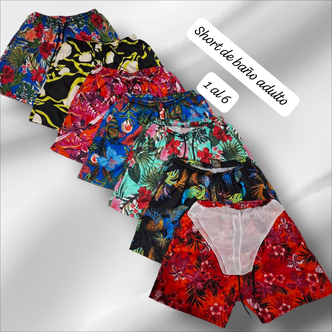 Añadiendo este producto al carrito estas comprando 1 (pack x 6) de short de baño de hombre, los colores van surtidos, uno x talle del 1 al 6.